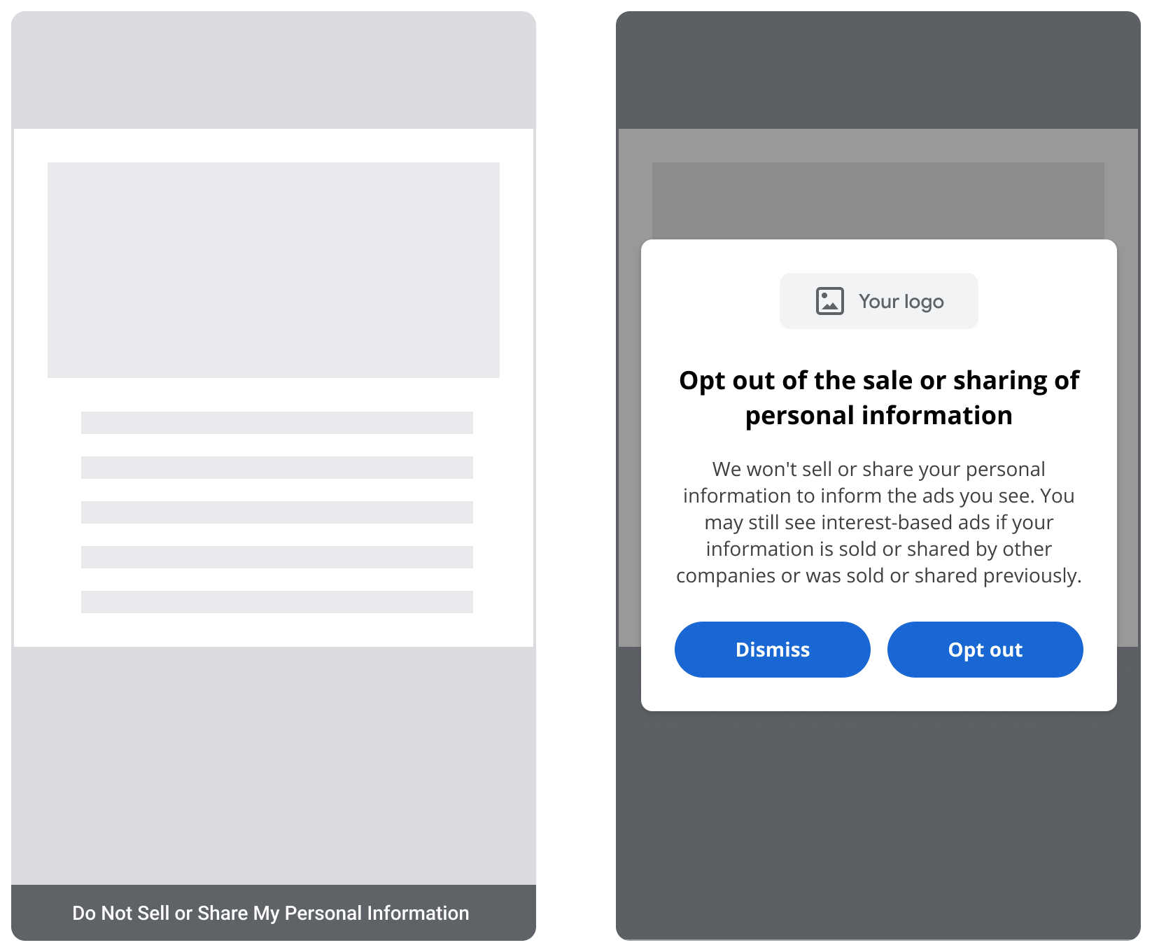 - "Opt out" button: Allows users to opt out of the “sale or sharing” of their “personal information” (as the law defines those terms). When users click the "Opt out" button, the message communicates their opt-out status to Google. Closes the message.